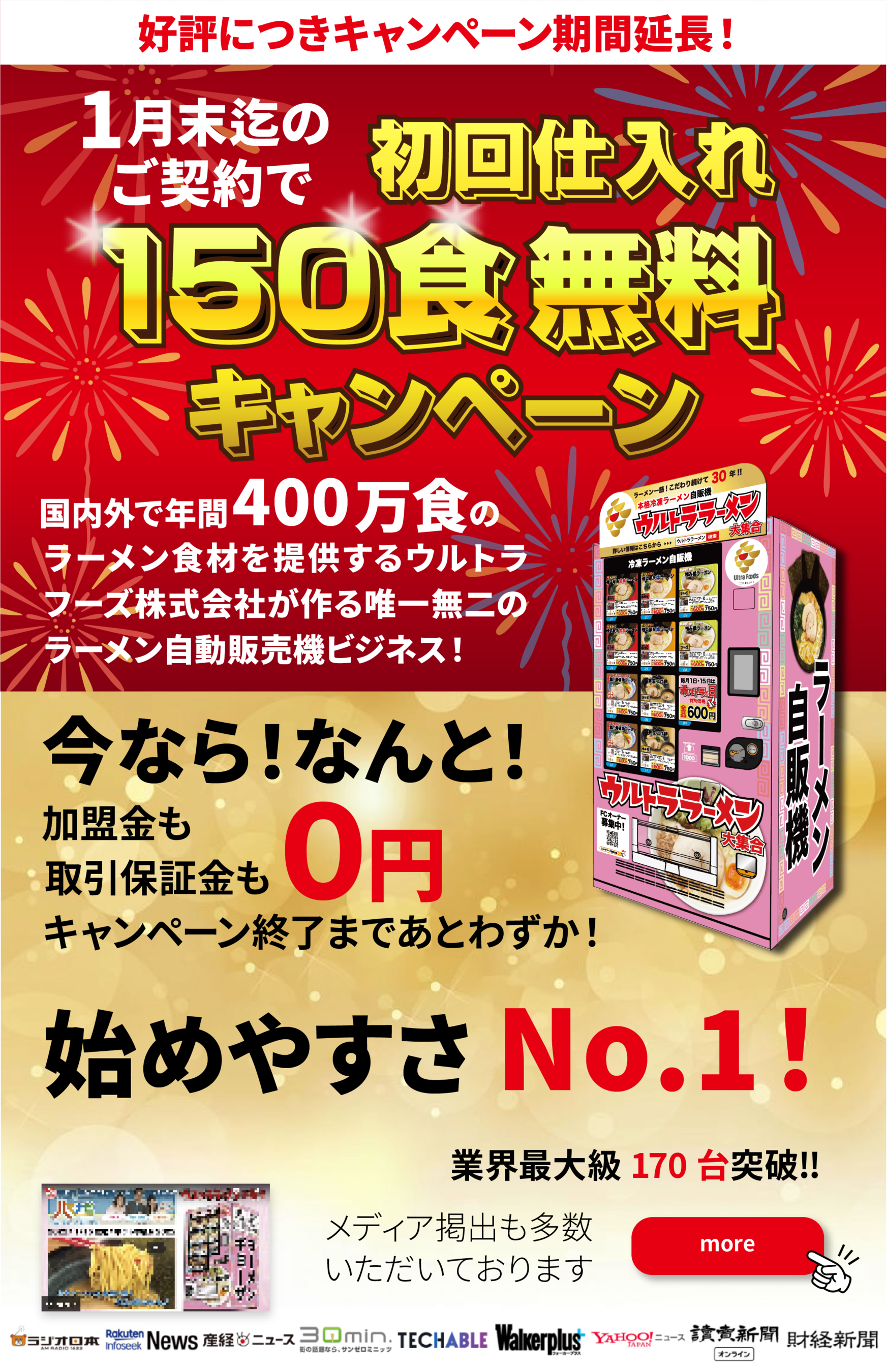 冷凍ラーメン自販機のオーナー募集 『ご好評につき期間延長!』【1月末までにご契約のお客様限定】 初回仕入れ分のラーメン150食 無料プレゼントキャンペーン開催中