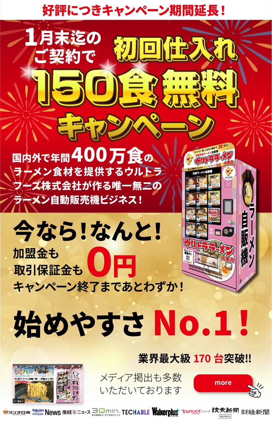 ウルトララーメン大集合の冷凍自動販売機事業を展開するウルトラフーズ株式会社(横浜市中区宮川町1-14-12 代表取締役 松野 克成)から冷凍ラーメン自販機のオーナー募集『ご好評につき期間延長!』