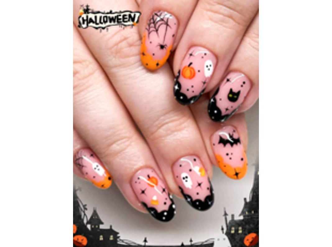 商品名:ハロウィン 24個入り ショート オーバル型 グロスブラック フォルスネイル パンプキン炎 スパイダーウェブ デザイン クールスタイル 偽ネイル 偽爪 フェイクネイル つけ爪