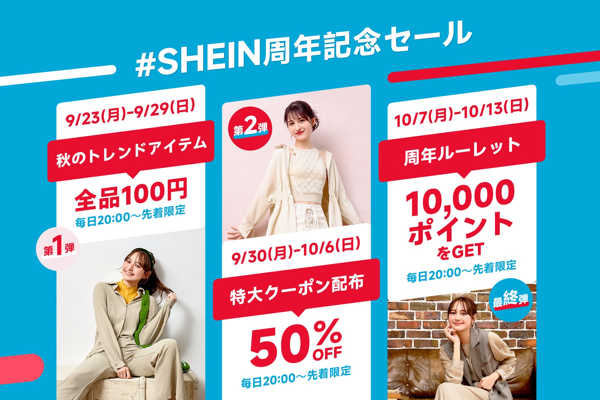 この度SHEINは、日頃のご愛顧に感謝の気持ちを込め、2024年9月23日(月)12:00~2024年10月14日(月)12:00までの3週間、50万点以上の商品を対象に最大90%オフでお買い求めいただける他、特大クーポンやポイントをゲットできる『SHEIN 周年記念セール』を第1弾~第3弾に期間を分けて実施しております。