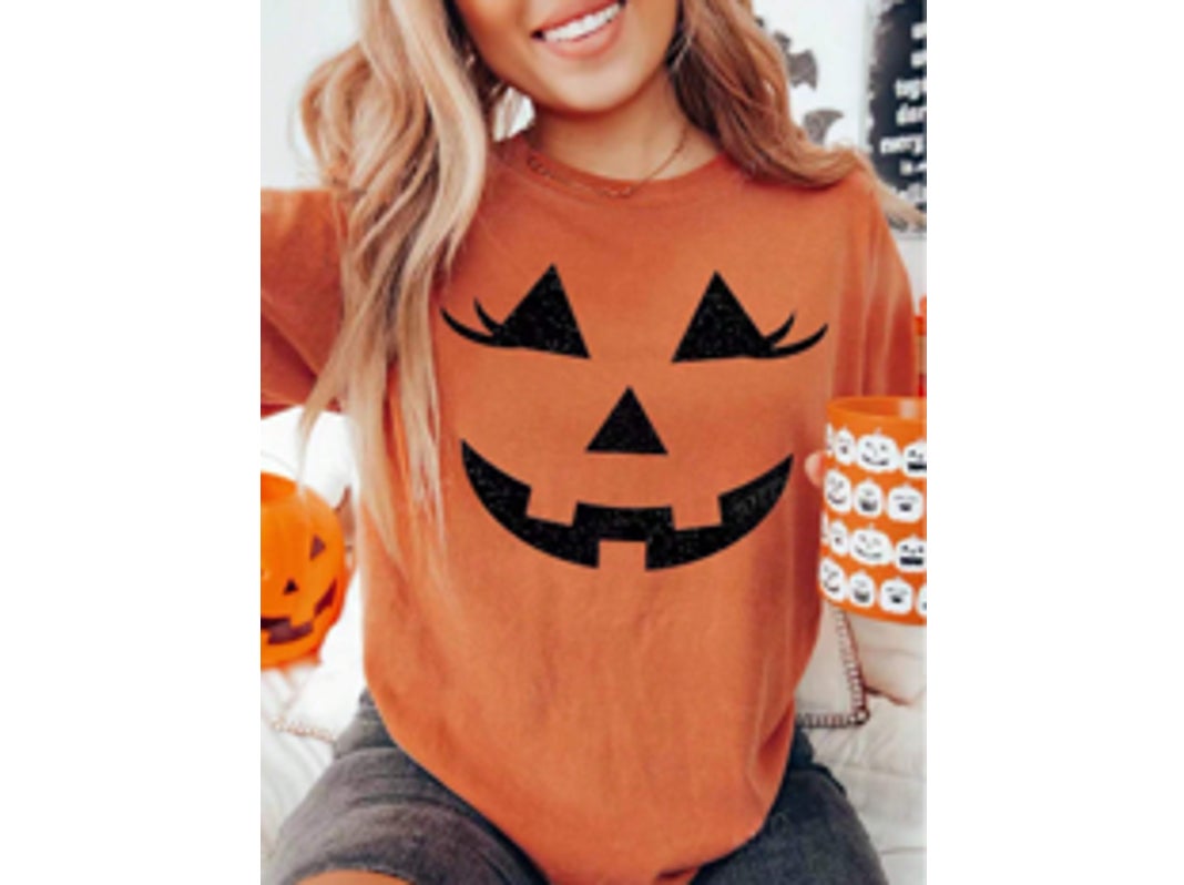 商品名:かわいいカボチャ笑顔プリントクルーネック半袖Tシャツ(レディース)、グラフィックティー
