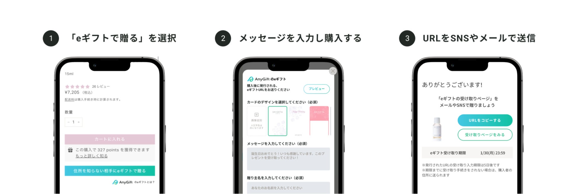 AnyGiftは、相手の住所を知らなくてもLINEやメールで贈ることができる「eギフト機能」を、ECサイトに組み込むことができるサービスです。