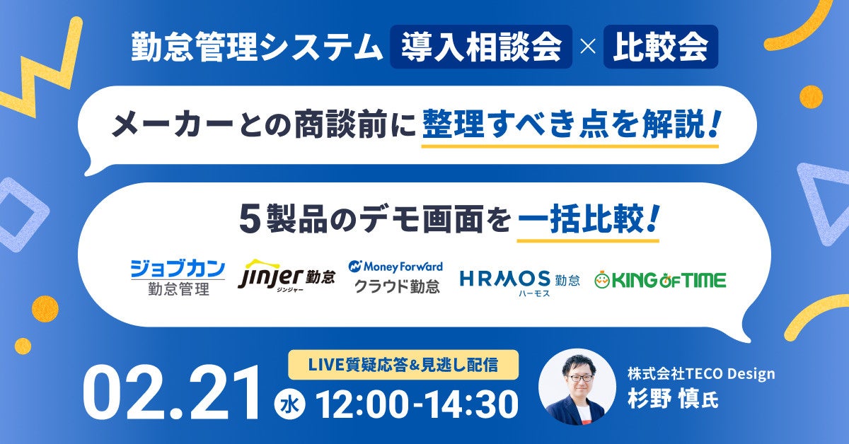 そのようなお悩みの解決に役立てるように、本ウェビナーでは、TECO Design社からメーカーとの商談前に整理すべき点についての解説と質疑応答を実施します。その後、勤怠管理システムのメーカー5社が登壇し、各社から製品概要・導入事例・デモ画面を解説するので、勤怠管理システムの選び方から各社のシステムの違いを整理することが可能です。