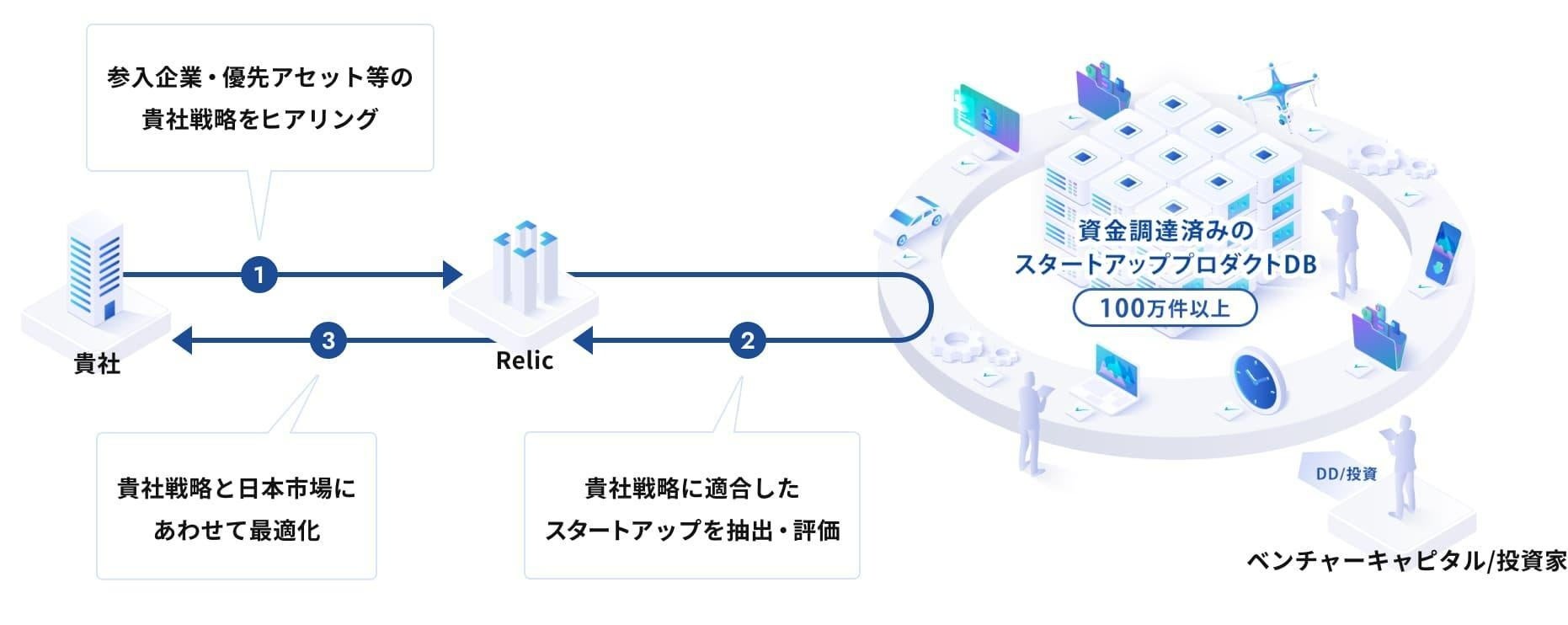 IDEATION Cloudは、事業アイデアを創出することに特化し制作した100万件以上の資金調達済み海外スタートアップデータベースから、日本市場未導入の革新的な新規事業アイデアを抽出・提供します。有力な海外VCが投資した少なくとも海外では成功の芽が出ている事業アイデアを起点に、Relicの新規事業開発の知見を活用して日本・各社に合わせたアイデアを検討することで、成功率の高いアイデアを効率的に創出します。
