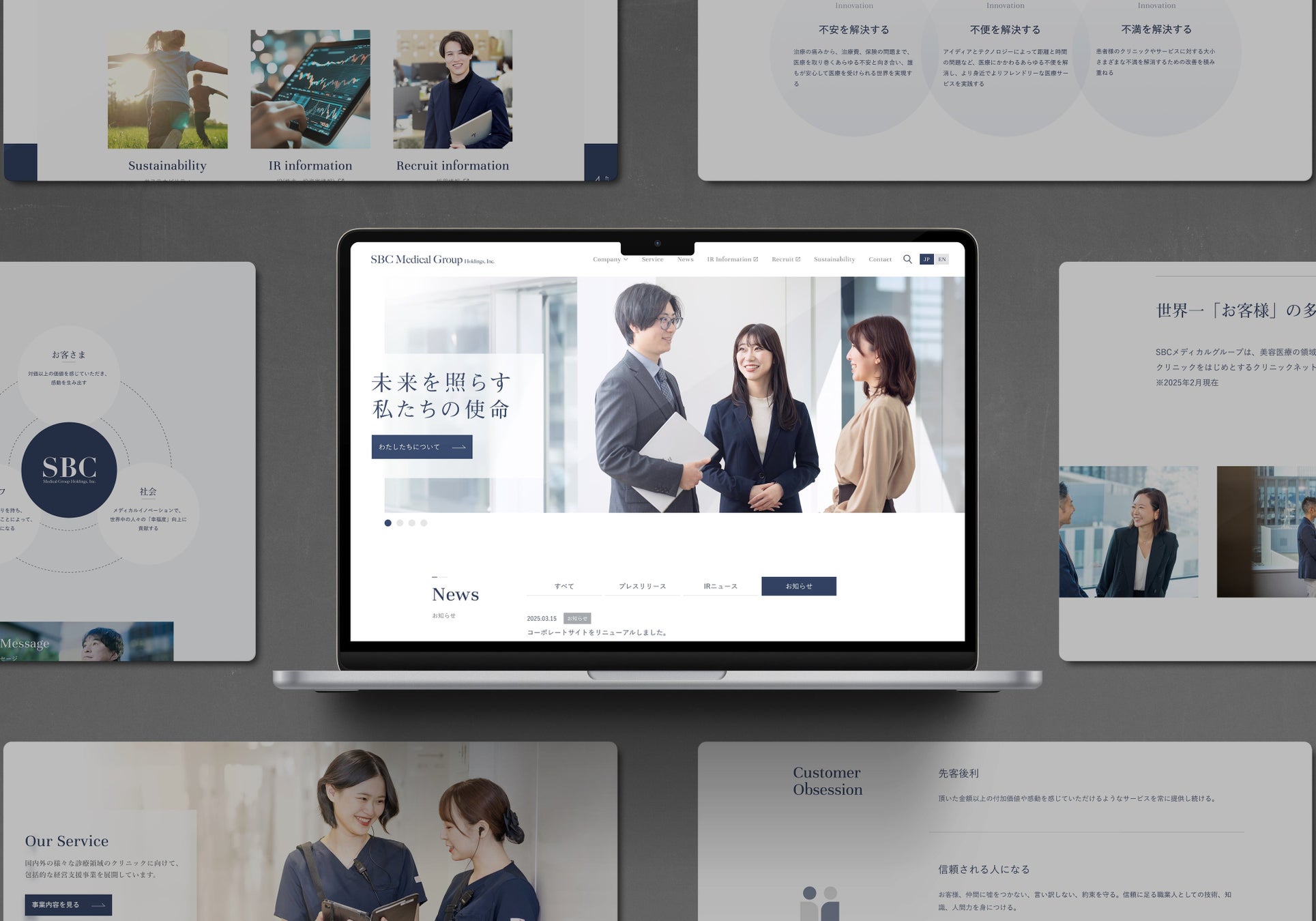 この度のコーポレートサイトリニューアルは、SBCの歩みと進化を分かりやすく伝え、さらなる成長へとつなげることを目的としています。現在、SBCが経営支援を行うクリニックネットワークは国内外247院に拡大し、美容医療、歯科、AGA治療、不妊治療、眼科、整形外科、再生医療など、幅広い分野をカバーしています。さらに、米国や東南アジア市場を中心に海外展開を加速させており、昨年のNASDAQ上場を契機に、国際競争力の強化と持続的成長を見据えた経営戦略を推進しています。