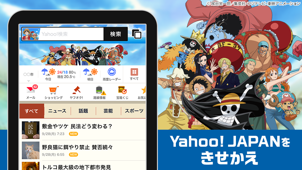 ・内容:「Yahoo! JAPAN」アプリ(iOS版、Android版)、スマートフォンブラウザ版「Yahoo! JAPAN」、「Yahoo!きせかえ」アプリ(Android版)において、スマートフォンを『ONE PIECE』特別仕様のデザインに無料できせかえられます。「Yahoo! JAPAN」アプリとスマートフォンブラウザ版「Yahoo! JAPAN」では、トップページと検索結果ページをきせかえられ、「Yahoo!きせかえ」アプリでは、壁紙やアイコンなどのホーム画面をきせかえられます。
