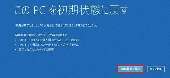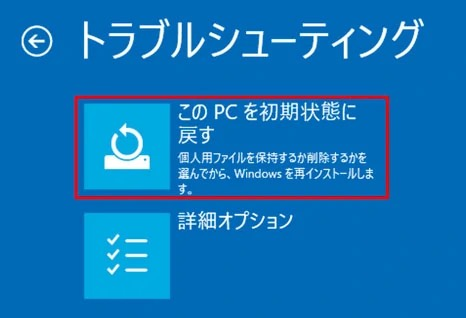 Step1:対処法3・4と同じ要領で「自動修復」画面を表示させ、「詳細オプション」>「トラブルシューティング」>「詳細オプション」>「このPCを初期状態に戻す」の順にクリックします。