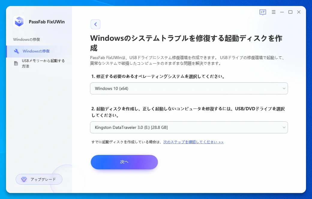Step1:操作可能な別のパソコンでPassFab FixUWinを起動して、USBまたはCD/DVDを挿入し、「今すぐ起動ディスクを作成する」をクリックします。