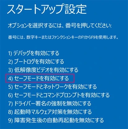 Step4:再起動後、下記の画面が表示されたら「4)セーフモードを有効にする」を選択して、問題の原因として疑われるソフトやドライバーを削除します。