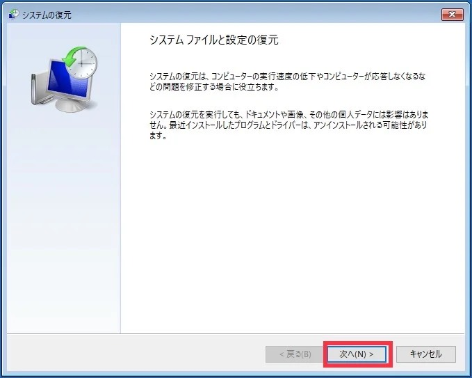 Step2:「システムファイルと設定の復元」画面で「次へ」をクリックすると復元ポイントの一覧が表示されますので、復元したいポイントを選択して、画面の指示に従って操作します。