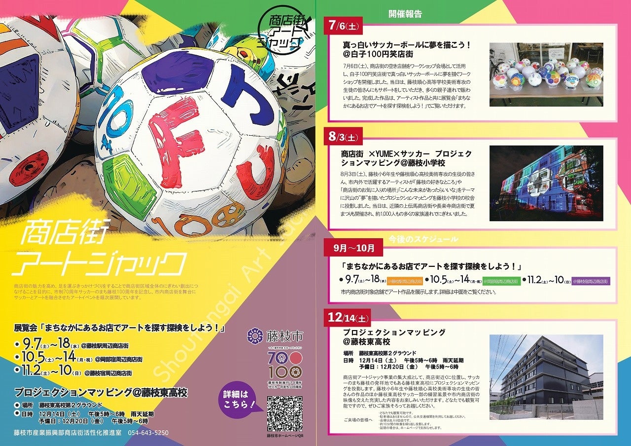 商店街の魅力を高め、足を運ぶきっかけづくりとして、7月からスタートした「商店街アートジャック事業」。その集大成として、商店街の近くに位置し、サッカーのまち藤枝の発祥の地である藤枝東高校でプロジェクションマッピングを投影します。