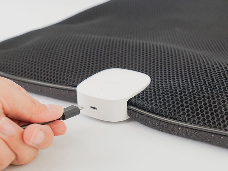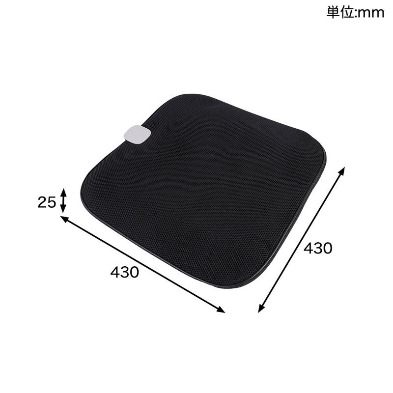 サイズは幅43×奥行43×高さ2.5cm。USB充電式。座面の奥部分にファンを4つ搭載。