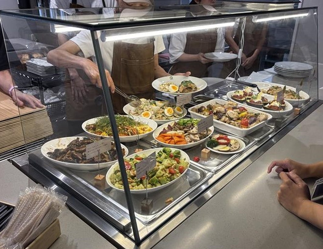 「ヘルスケアスタジオ」では、体内の最終糖化産物を測定するAGEsセンサや肌測定機器などを設置し、来場者が自由に自身の健康状態をチェックできる環境を整備。取得した測定データはAIが分析し、個々の状態に応じた食事メニューを提案、隣接する「スクエアキッチン(カフェ)」で提供