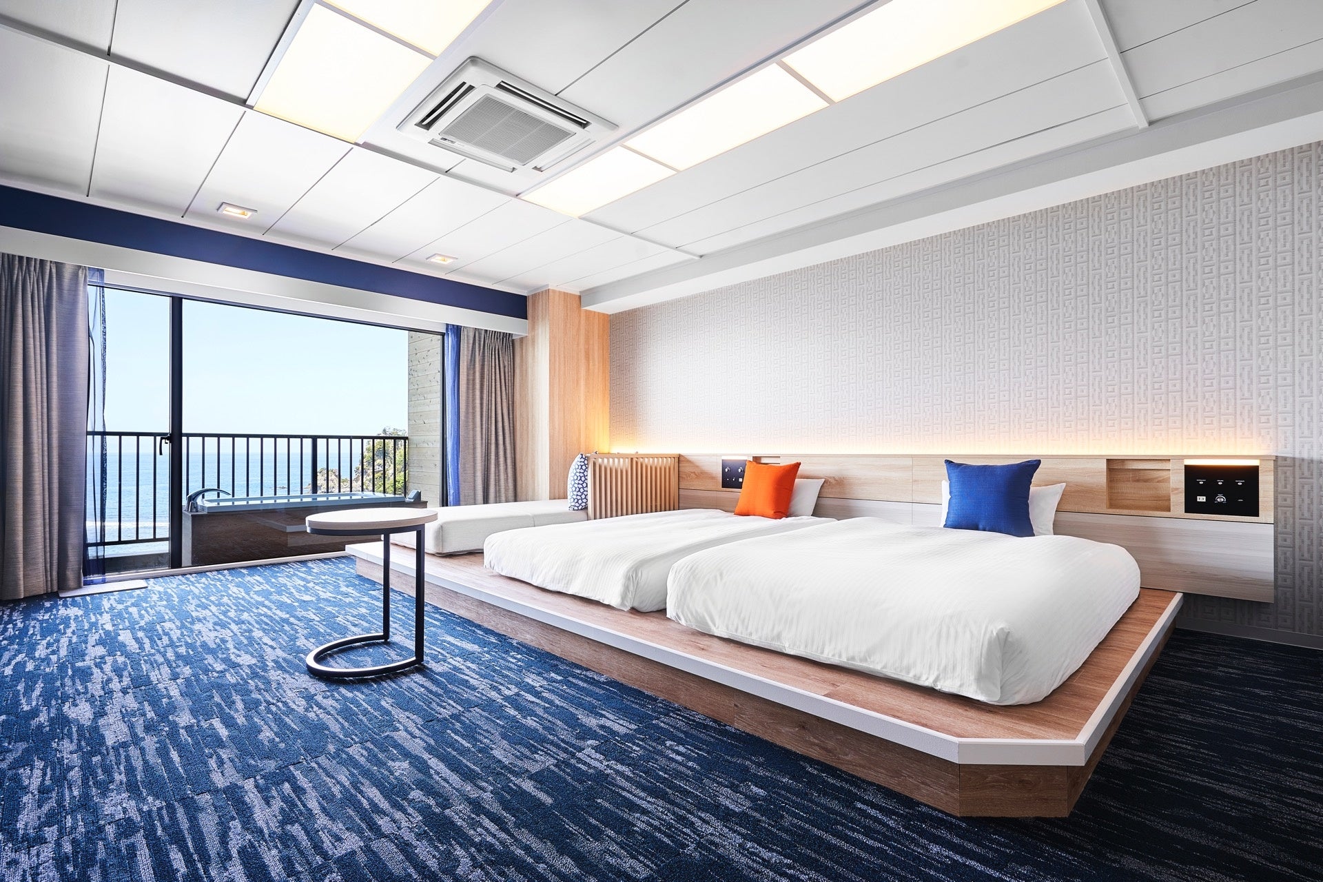 館内は、ひろがる青い海と空をテーマにした開放感あふれる空間設計。チェアに腰掛け、ワインやリモンチェッロを片手に、旅のひとときを忘れるような上質な時間が流れます。全7タイプの客室はすべてオーシャンビューとなっており、伊豆の空と海の景色を存分に堪能できます。さらに、各部屋に備え付けられた露天風呂からは、贅沢な眺望もお楽しみいただけます。