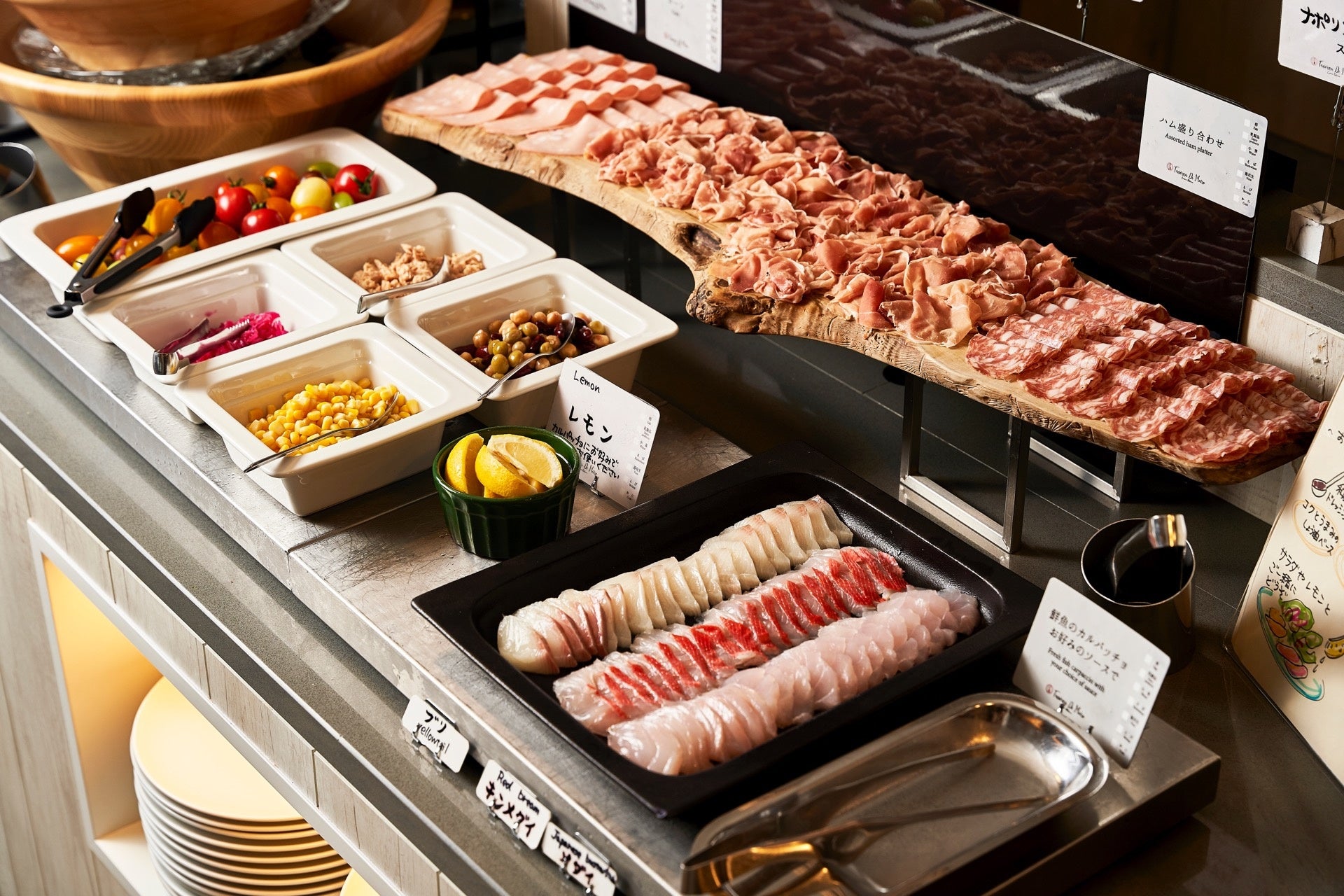 滞在中は、シャンパンやワインなどを自由に楽しめるフリーフローサービスをご用意。また夕食には、伊豆の海と山の恵みを活かしたイタリアンビュッフェを、朝食には和洋ビュッフェを用意し、海辺のリゾートならではの食体験をお楽しみいただけます。