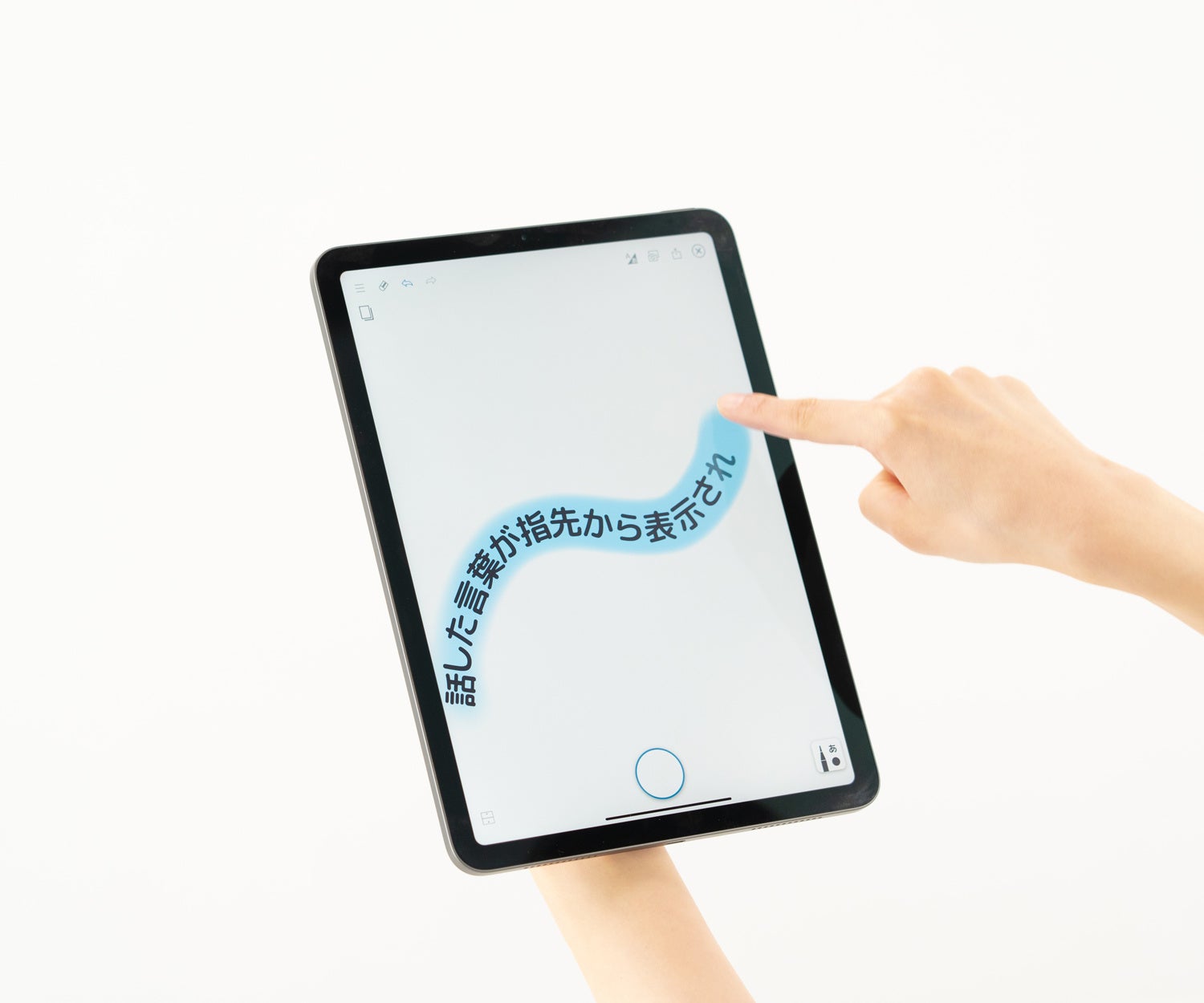 ・タブレットの画面を指で長押しして話しながらなぞると、話した言葉を必要な言語に翻訳してなぞった軌跡に文字で表示