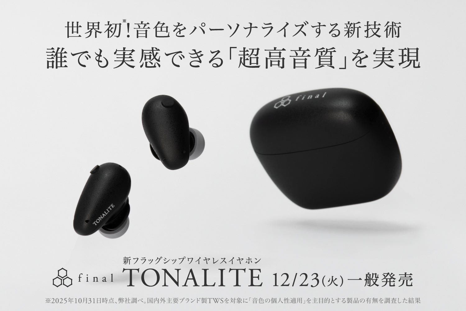 国内オーディオメーカー株式会社final(代表:細尾 満、本社:神奈川県川崎市)は、世界初*1の音色パーソナライズ技術「DTAS® for Personalized Timbre™(ディータス フォー パーソナライズド タンバー)」を搭載したフラッグシップワイヤレスイヤホン「TONALITE トナリテ」を2025年12月23日(火)より一般発売いたします。