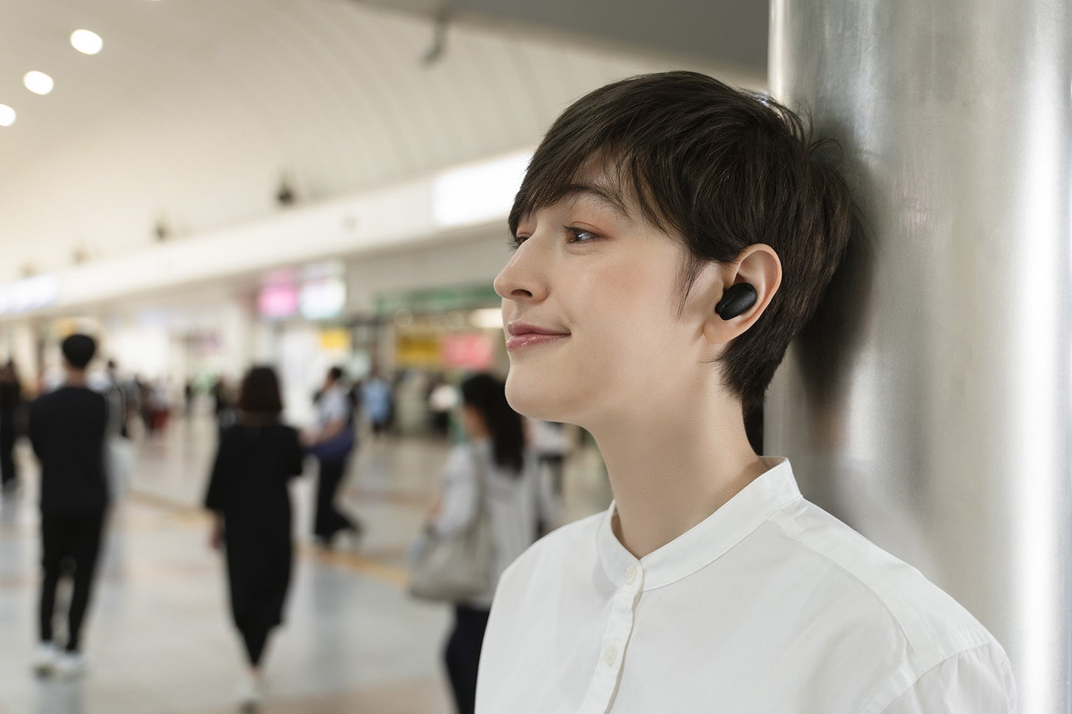 バッテリーや基板などの大型パーツを筐体の外側(耳の外に出る部分)へ配置し、耳への挿入部を極限まで小型化。これにより、耳の小さな方でも圧迫感のない快適な装着性を実現しました。さらに、イヤーピースにはシリコンの柔軟性とフォームの遮音性を兼ね備えた「FUSION-G」を採用。高い遮音性能を維持しながら、長時間の使用でも疲れない優しい着け心地を両立しています。