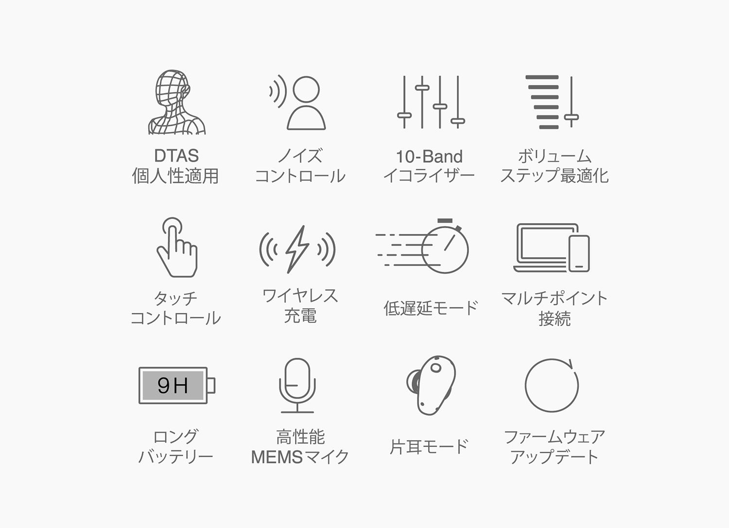 DTAS個人性適用/ノイズコントロール/10バンドイコライザー/ボリュームステップ最適化/タッチコントロール/低遅延モード/マルチポイント接続/ゲイン設定/ファームウェアアップデート
