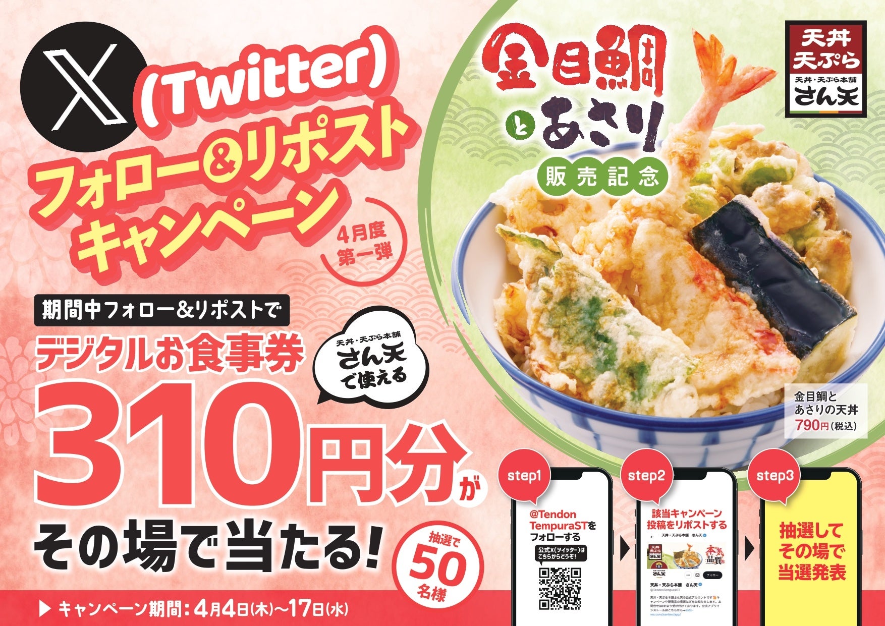2024年4月4日(木)~4月17日(水)まで、金目鯛とあさりフェア販売記念として「デジタルお食事券310円分」がその場で50名様に当たる、お得なXキャンペーンを開催します。天丼・天ぷら本舗さん天のX公式アカウントをフォローし、キャンペーンポストをリポストすることで抽選いただけます。会計から310円引きになる本お食事券は金目鯛とあさりの天丼をはじめ、「天丼・天ぷら本舗 さん天 」の各店舗で様々な商品にご利用いただけます。