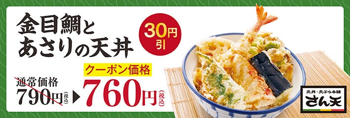 「天丼・天ぷら本舗 さん天」公式アプリでは、販売期間中に使える「金目鯛とあさりフェア 30円引きクーポン」を配信いたします。会員の方限定でご利用いただけるクーポンですので、この機会にぜひ「天丼・天ぷら本舗 さん天」公式アプリをダウンロード&会員登録ください。