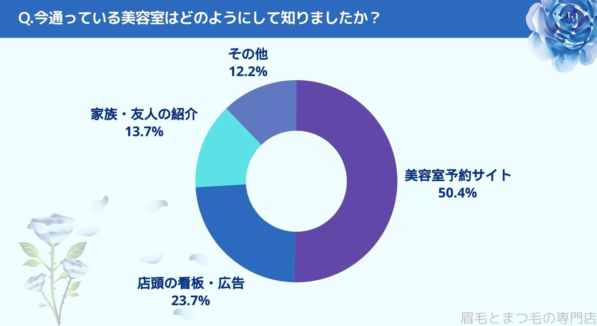 今通っている美容室を知ったきっかけをお聞きしたところ「美容室予約サイト(50.4%)」、「店頭の看板・広告(23.7%)」、「家族・友人の紹介(13.7%)」、「その他(12.2%)」という結果になりました。