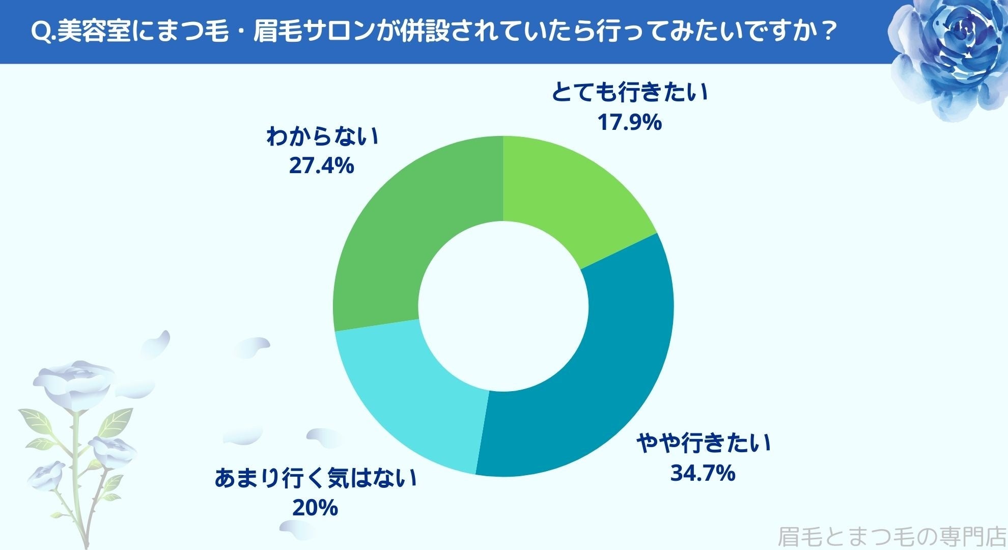 美容室にまつ毛・眉毛サロンが併設されていたら行ってみたいかお聞きしたところ「とても行きたい(17.9%)」、「やや行きたい(34.7%)」、「あまり行く気はない(20%)」、「わからない(27.4%)」という結果になりました。