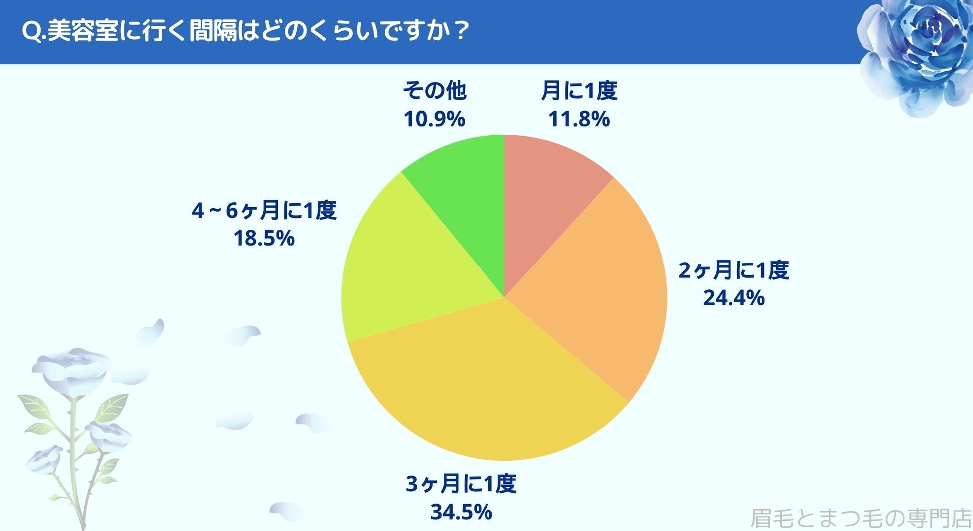 美容室に行く間隔をお聞きしたところ「月に1度(11.8%)」、「2ヶ月に1度(24.4%)」、「3ヶ月に1度」、「4~6ヶ月に1度(18.5%)」、「その他(10.9%)」という結果になりました。