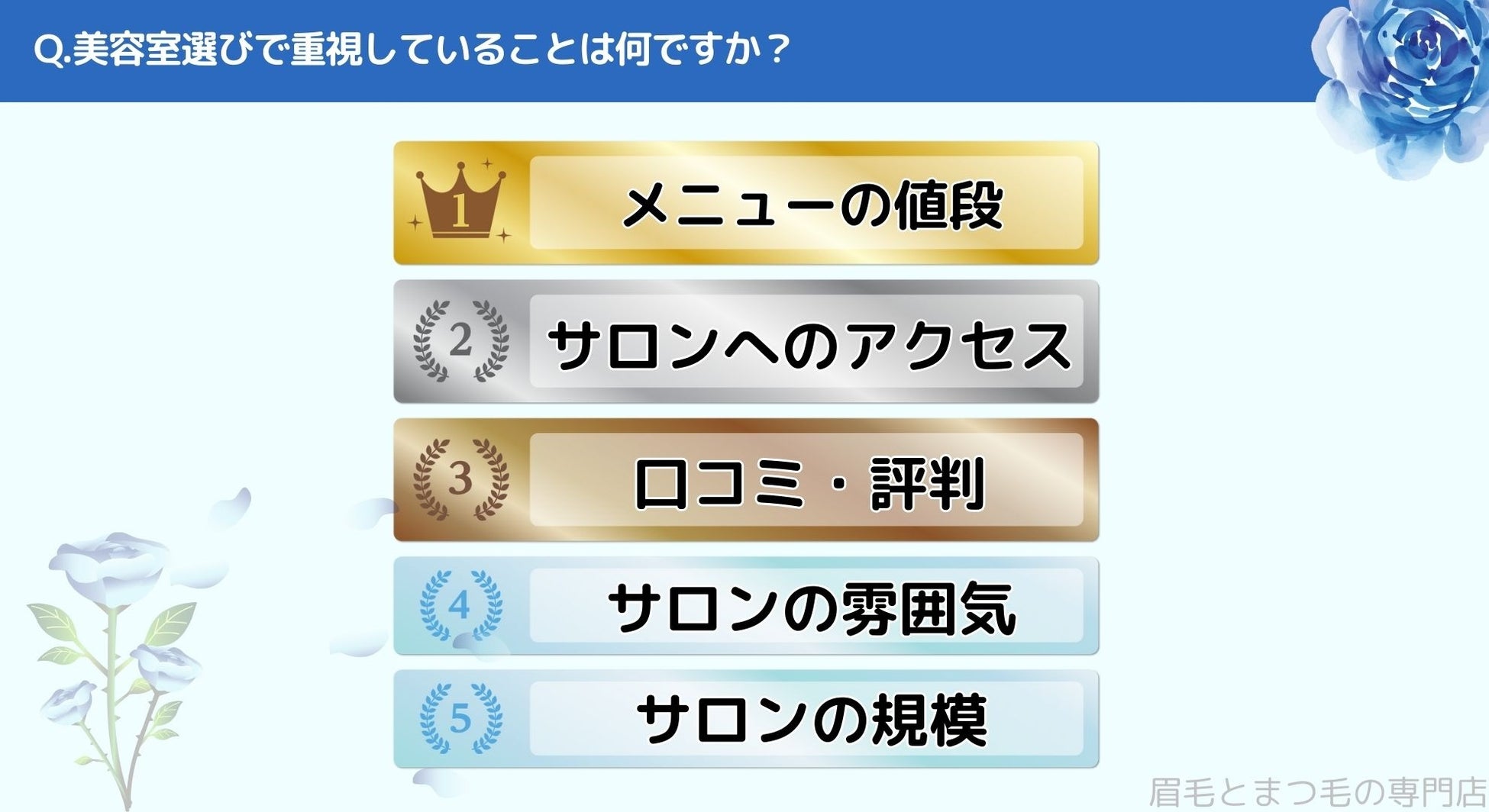 美容室選びで重視していることをお聞きしたところ「1位>メニューの値段」、「2位>サロンへのアクセス」、「3位>口コミ・評判」、「4位>サロンの雰囲気」、「5位>サロンの規模」という結果になりました。