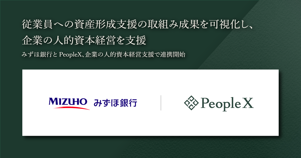 株式会社みずほ銀行(頭取:加藤 勝彦、以下「みずほ銀行」)と株式会社PeopleX(代表取締役CEO:橘 大地、以下「PeopleX」)は協働して、従業員の資産形成支援やエンゲージメント向上に向けてソリューションを提供し、また、こうした企業の取組みの成果を定量的に可視化することで、企業の人的資本経営の取組みを支援していきます。