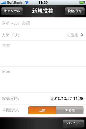 カテゴリの追加・選択/画像添付/撮影した写真の添付/投稿日時設定/