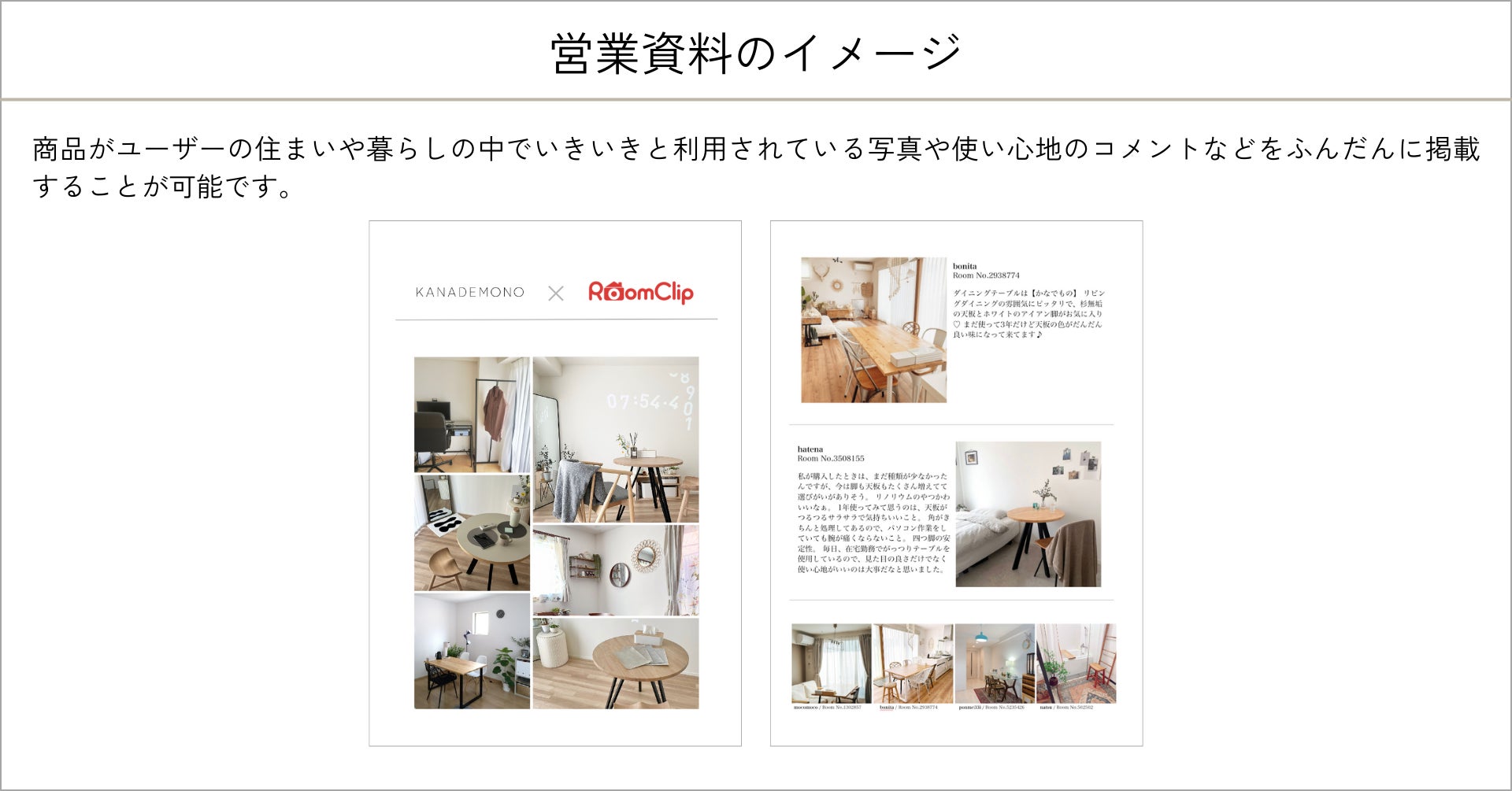 ルームクリップ株式会社(本社:東京都渋谷区、代表取締役CEO:髙重正彦、以下ルームクリップ)は、家具や家電、生活用品など住生活関連のメーカー向けに、量販店バイヤーとの棚取りのための商談を支援するパッケージプランの販売を開始します。当社の運営する住生活の領域に特化した日本最大級のソーシャルプラットフォーム「RoomClip」のユーザーコミュニティとデータを活用し、消費者が実際に商品を利用している写真やコメント、利用シーンに関する最新の住まいのトレンドを活用した商談資料や販促物などを作成・提供するほか、営業や取引先向けのトレンドや販売に関する研修セミナーなども開催します。