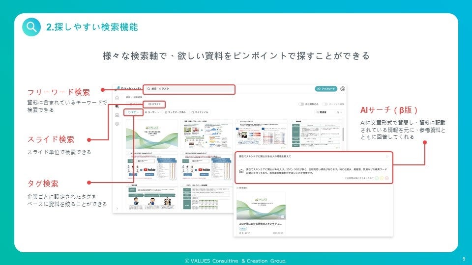 自動的に付与されたタグで資料を検索できるのに加え、検索結果をスライド単位でも表示でき、必要なスライドを簡単に探すことが可能です。また、社内の人気資料で絞る、AIに直接必要な情報を質問して回答してくれるなど、ニーズに応じた様々な検索体験を提供します。