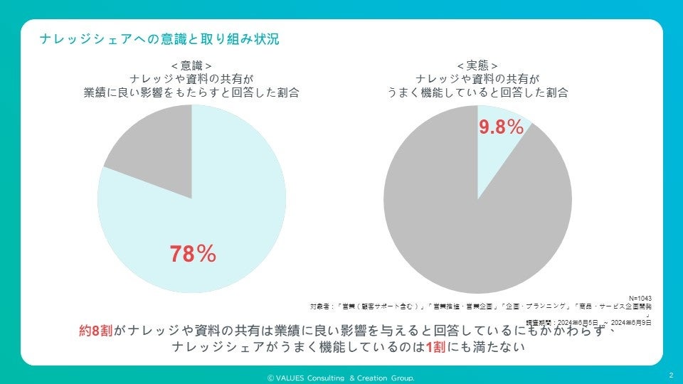 企業の営業組織や提案現場では、90%以上の人がナレッジや資料の共有が組織にとって重要な取り組みだと考えているにもかかわらず、実際にナレッジシェアがうまく機能していると回答した割合は9.8%と非常に低くなっています。