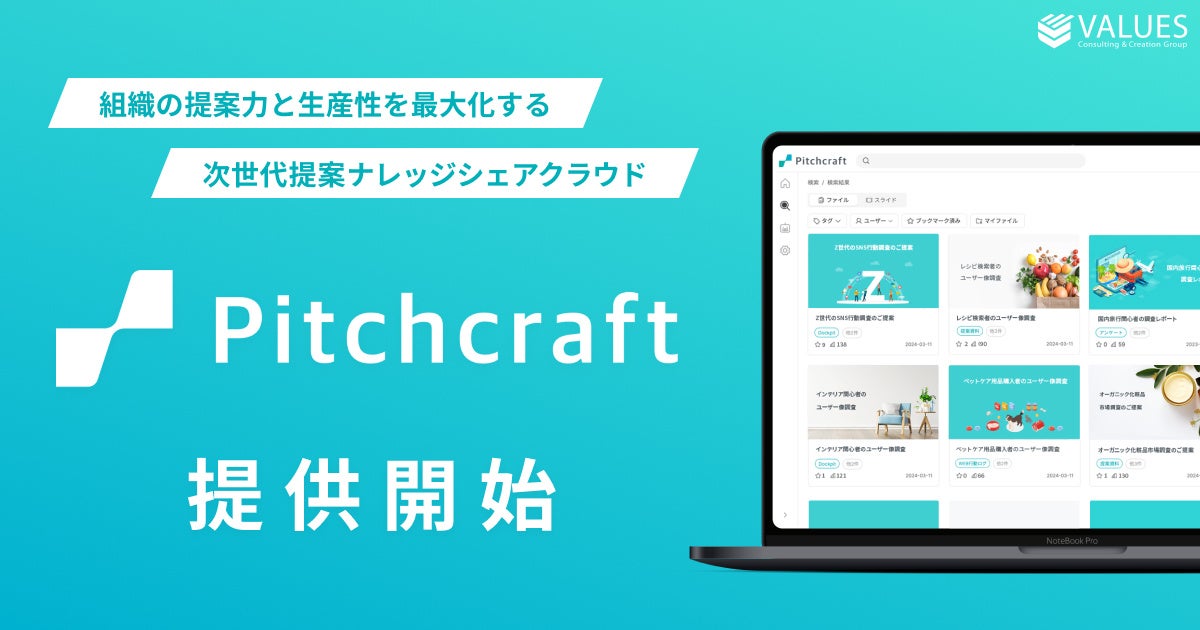 インターネット行動ログ分析によるマーケティング調査・コンサルティングサービスを提供する株式会社ヴァリューズ(本社:東京都港区、代表取締役社長:辻本 秀幸、以下「ヴァリューズ」)は、「個人ナレッジをみんなの価値に変え勝ち続ける組織へ」をコンセプトに開発した次世代提案ナレッジシェアクラウド「Pitchcraft(ピッチクラフト)」を2024年7月2日(火)から提供開始いたします。