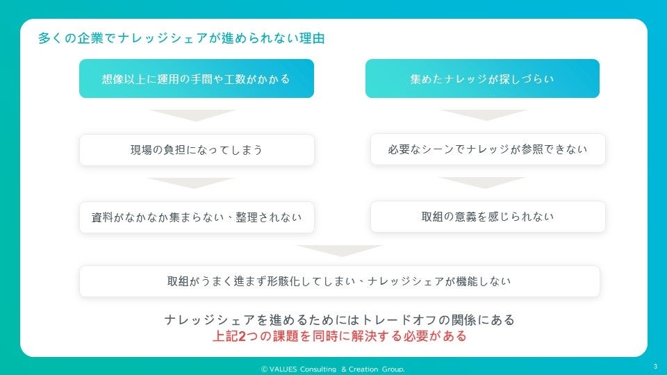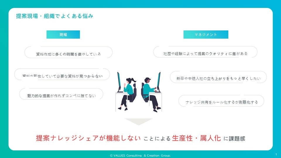 ナレッジマネジメントやナレッジシェアが機能しないことにより、提案クオリティのばらつきが大きくなり属人化が進む、資料作成や探索に余計な時間がかかり生産性が落ちてしまう、新規入社者の立ち上がりスピードが遅くなるなどの問題が提案現場や組織で生じています。