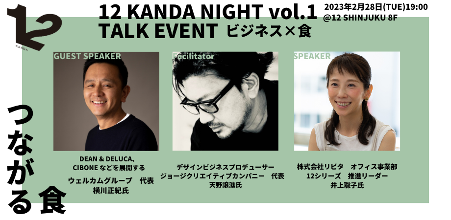 2024年2月のオープンに先駆けて、全国4会場で「食×ビジネス」をテーマとしたイベントを開催します。第1回の「12 KANDA NIGHT vol.1」は、2023年2月28日に開催しており、ゲストにウェルカムグループ代表の横川正紀さんをお招きして、約40名の方にご来場いただきました。第2回以降も食で多彩なビジネスを展開されているゲストをお迎えして、トークセッションと懇親会を予定しています。※イベントの内容は変更する可能性があります。