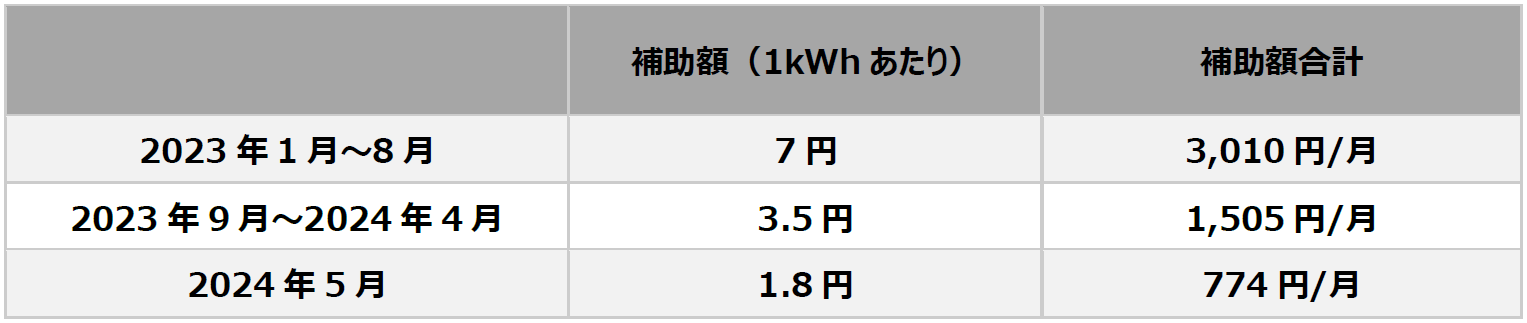 燃料価格急騰などの影響から、2023年1月から8月までの電気料金は1kwhあたり7円でした。その後、支援策として9月から1kwhあたり3.5円の補助が行われましたが、2024年5月には1.8円に減額。6月使用分からは補助金が完全廃止されます。3人世帯の家庭の場合、昨年6月と比較して今年は補助金で賄われていた3,010円分が増額となります。電力消費が多い家庭や世帯人数の多い家庭では、さらに値上げの影響が顕著となりそうです。