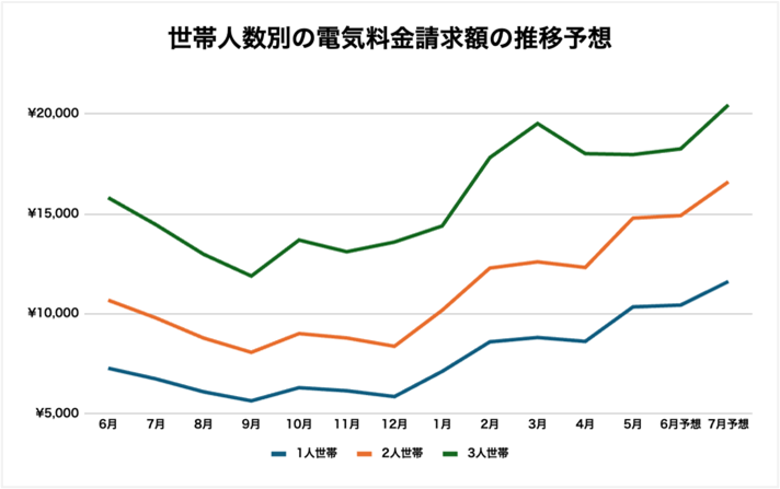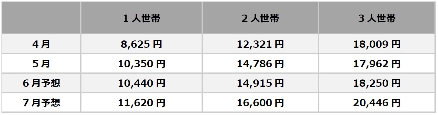 補助金の減少に伴い電気料金は増額し続けていますが、気温上昇により消費電力量が増加する7月は特に家計への影響が大きくなることが予想されます。3人以上の世帯は月20,000円を超え、今夏の負担は厳しい見通しです。