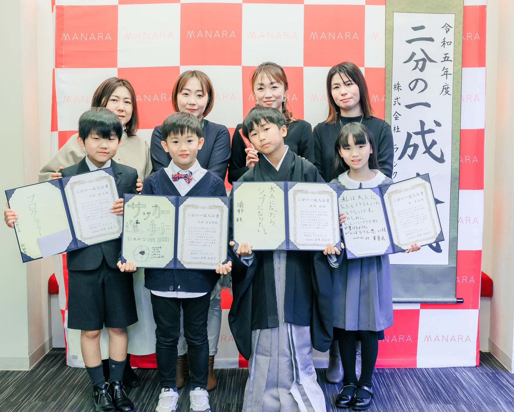 この度、成人の日直前の2024年1月5日(金)、大人への折り返し地点でもある10歳を祝福するとともに、働くことに対しての理解や、普段家でしか見ていないママの働いている姿を見ることで仕事への興味喚起につなげるべく、10歳になる社員の子ども4名が初めての『2分の1成人式』を開催しました。