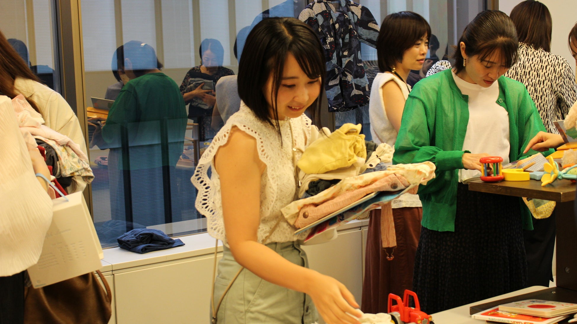 子どもの成長とともにサイズアウトしてしまった洋服など短期間で使わなくなってしまった育児用品を、社内で育児用品を必要としているママ・パパに譲渡するイベント。