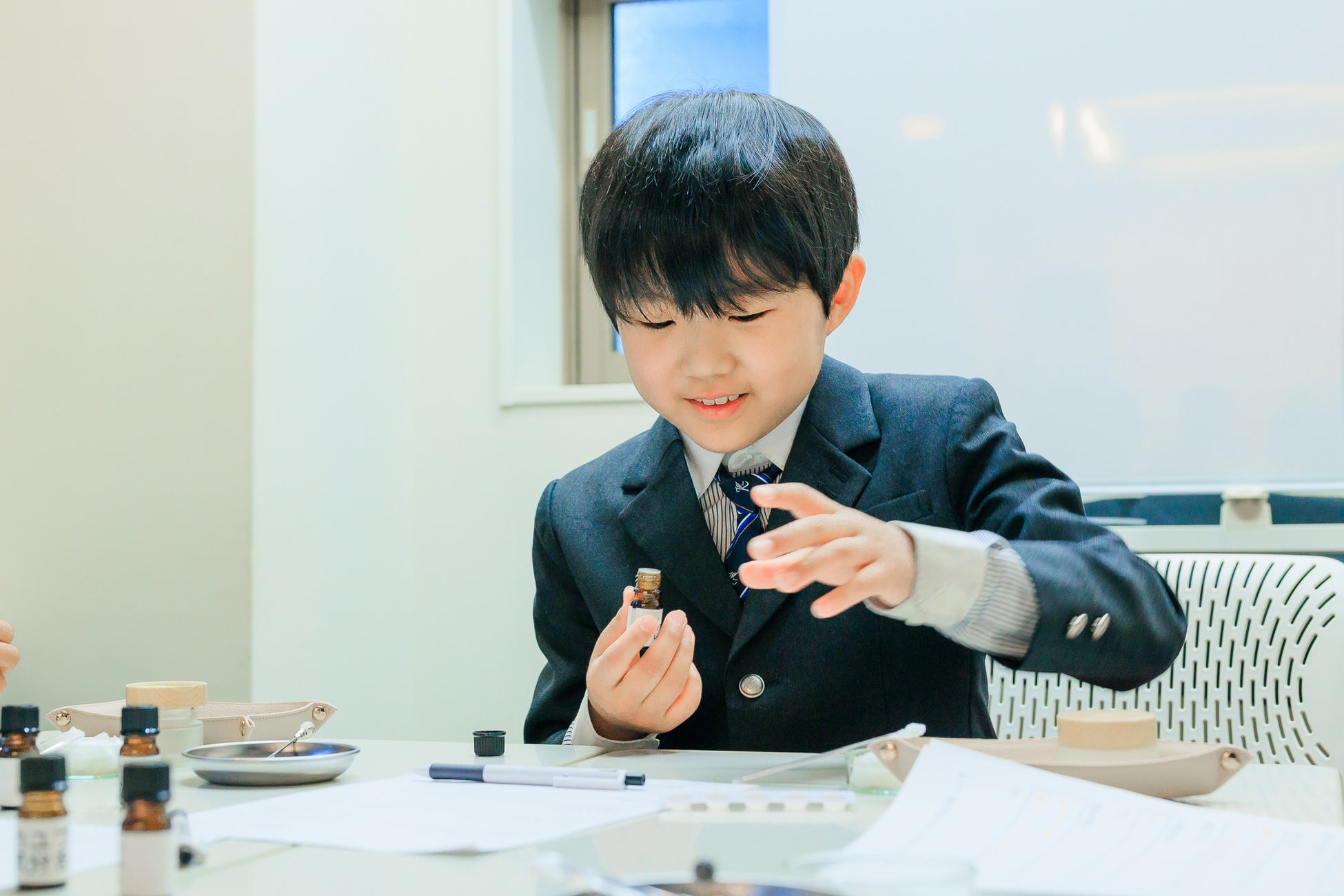 子どもたちは、当社が製品を開発する上で大切にしている「たった1人の悩みを解決することで、世界中の人達の幸せに貢献する」というミッションの説明を受けて、「たった1人の誰のために」、「どんな時に使ってほしくて」、「どんな香りを配合したか」などのプレゼンシートを作成しました。子ども達は親や友人の為に、思い思いの香りを調合し、容器にはデコレーションを施しました。