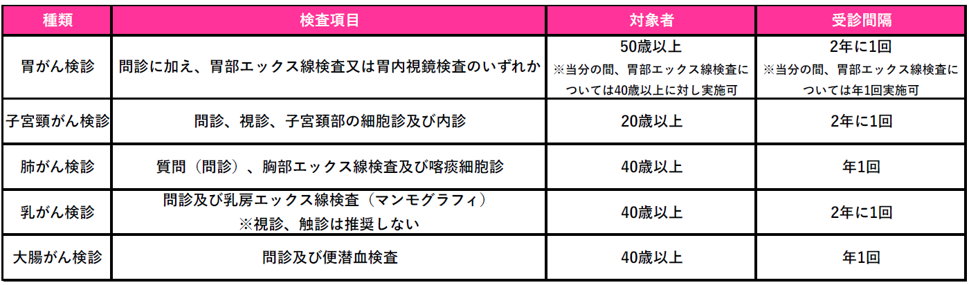 厚生労働省においては「がん予防重点健康教育及びがん検診実施のための指針」(平成20年3月31日付け健発第0331058号厚生労働省健康局長通知別添)を定め、市町村による科学的根拠に基づき下記の検診を推進しています。今回のアンケート項目はこの指針に基づいて作成しています。