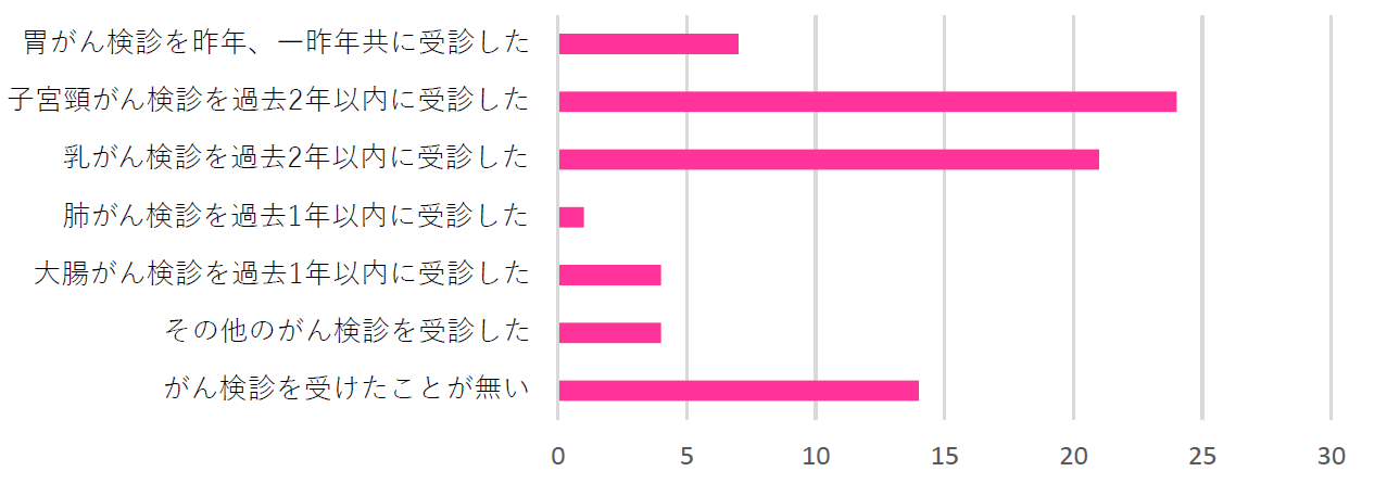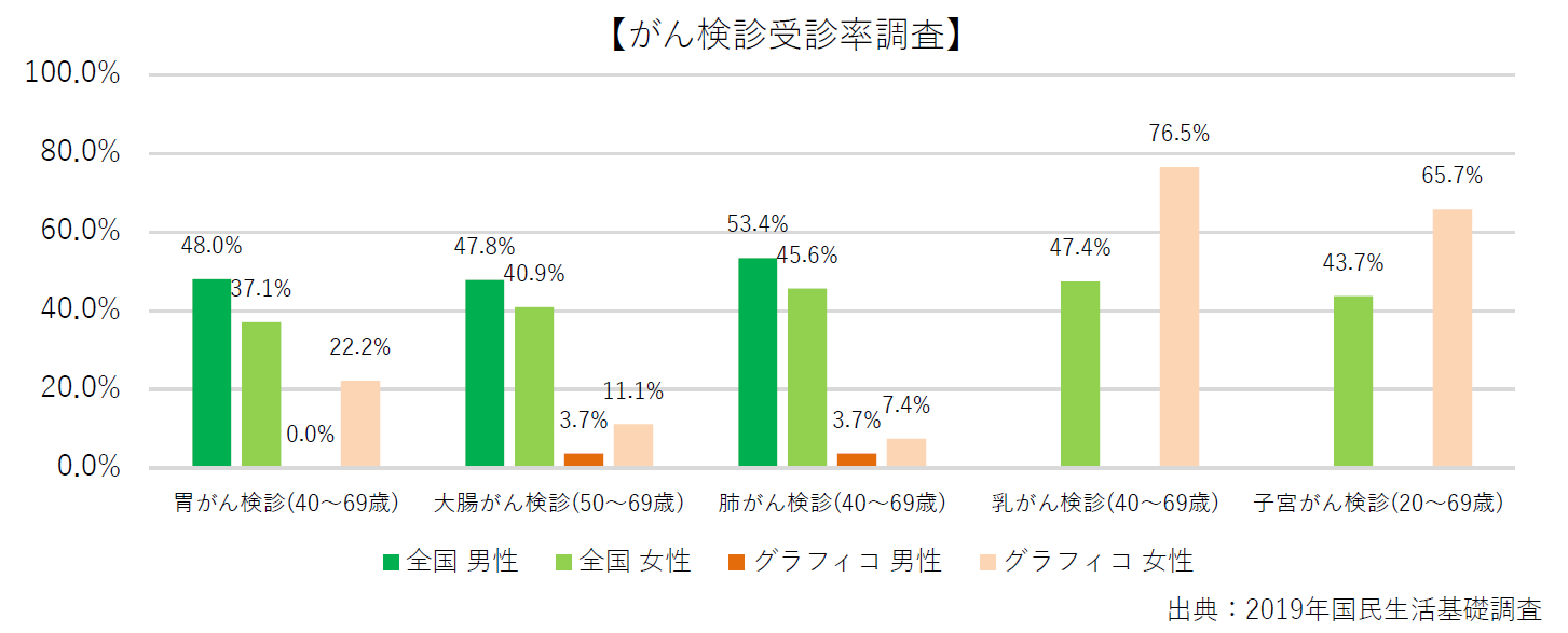 国は「胃がん」「肺がん」「大腸がん」「子宮頸がん」「乳がん」の検診受診率目標を50%としていますが、現状多くの項目で目標の受診率を下回っているのが現状です。グラフィコ社内でもがん検診に関するアンケートを実施したところ、子宮頸がん・乳がん検診が全国平均を大きく上回る受診率となった一方で、他のがん検診の受診率は全国平均を大きく下回りました。
