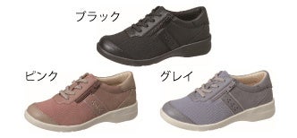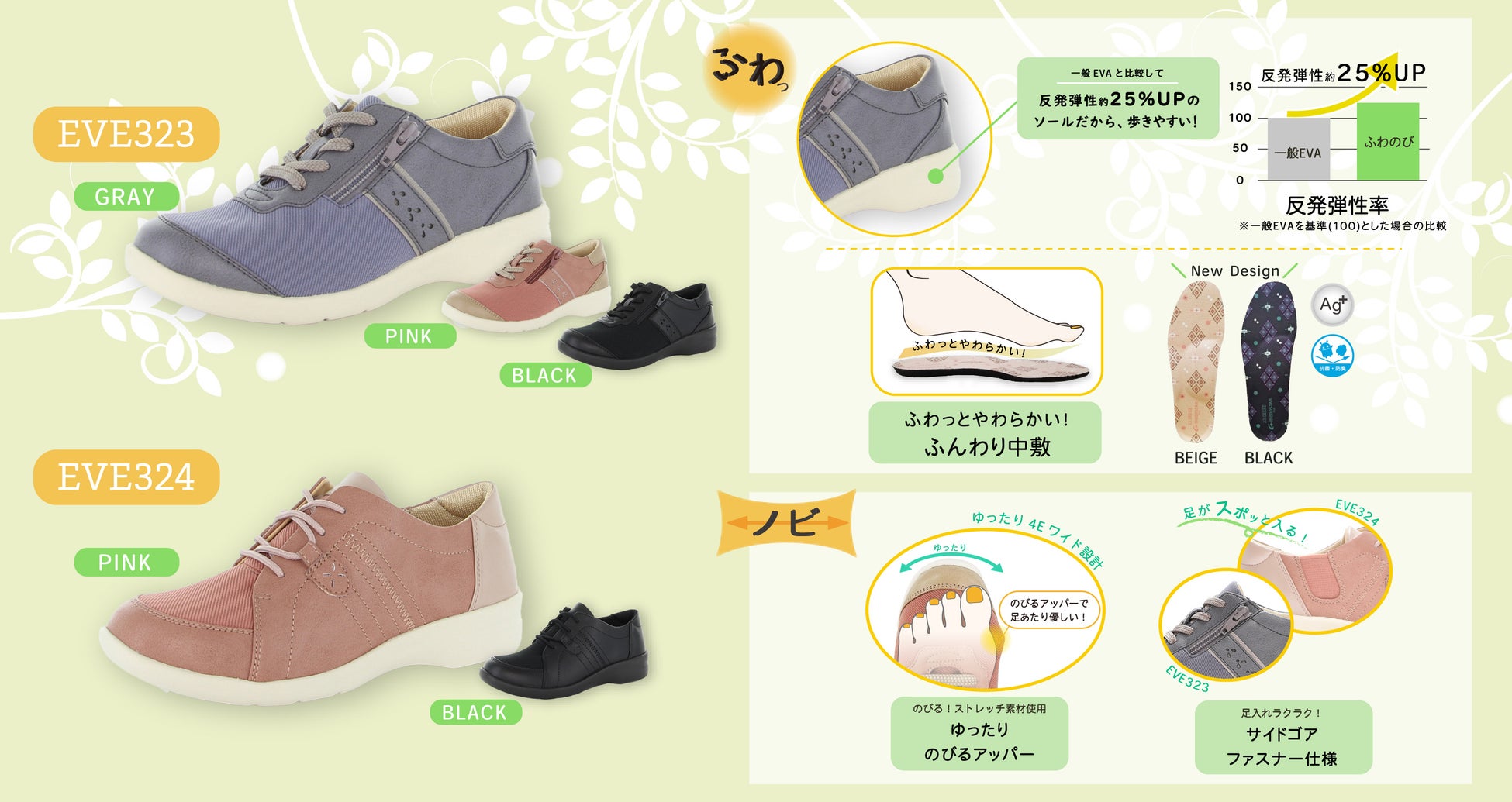 シニア層が靴を選ぶ際のポイントとして、履きやすさや歩きやすさなどの「快適性」を重視していることから開発しました。ソールは一般EVAと比較して反発弾性約25%UP。弾力性に優れたソールが快適な歩行をサポートし、「ふんわり中敷」は足に柔らかくフィットします。甲には足当たりが優しいストレッチ素材を使用しています。内羽根タイプのEVE323はファスナー付きでサイドのパンチングがポイント。カラーはブラック、ピンク、グレイの3色展開です。外羽根タイプのEVE324はサイドゴア付きでサイドのステッチがポイント。カラーはブラックとピンクの2色展開です。