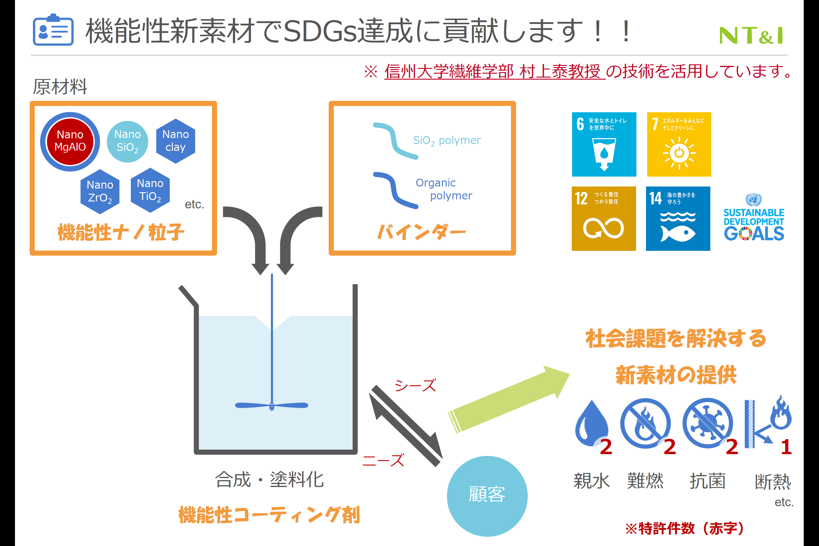 NT&Iは「有機成分と無機成分を最適な構造で組み合わせ、両方の特性を活用する」という信州大学の技術(有機・無機ハイブリッド技術)を基盤に、新しい機能性材料を開発するメーカーです。従来の混合技術や有機高分子・無機物単独では実現できない機能を有した微粒子とポリマーを塗料化することで、幅広い分野への利用が可能な製品を開発しています。