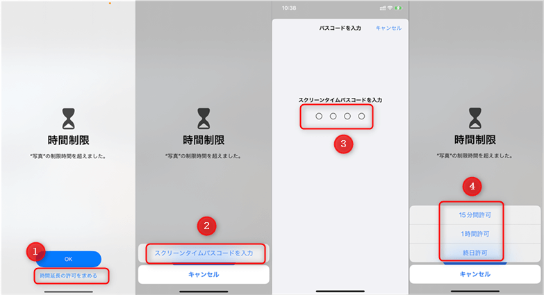 スクリーンタイムの時間制限を無視するには、「制限を無視」または「時間延長の許可を求める」をタップしてください。次はスクリーンタイムのパスワードを入力して、使用時間を選択します。
