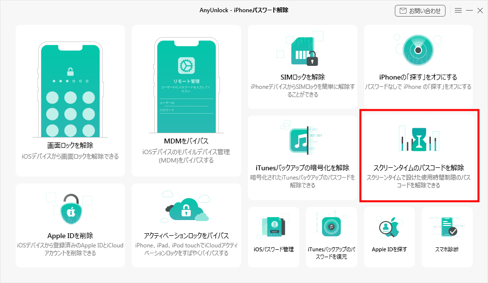 AnyUnlockはスクリーンタイムパスコードを解除するだけでなく、iPhoneの画面ロックを解除、Apple IDを削除、iTunesバックアップ暗号化の設定などを安全に解除できます。
