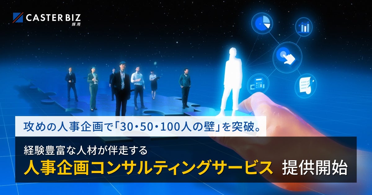 「CASTER BIZ 採用」(HP:https://recruiting.cast-er.com/)では、累計550社以上の採用活動をサポートするなかで集まった人事の方のリアルな声をもとに、採用にとどまらない「人事企画コンサルティング」の提供を開始することにいたしました。人事経験もコンサルティング経験も豊富な人材が人事チームの一員として、人事企画から導入・定着支援までワンストップでサポートいたします。