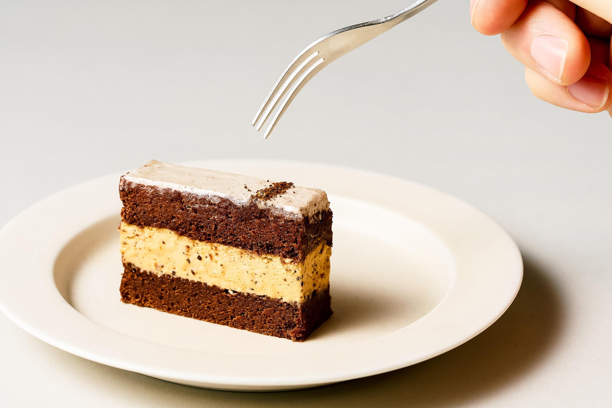 香り高いコーヒーに合わせて、しっとりとした食感の生ガトーショコラ生地には、草花のような華やかな香りをもつ「SAVORY」というフレーバーと、カカオ由来のナッツのようなフレーバーの「NUTTY」の2種のチョコレートをブレンドして用いました。さらに上部には、コーヒーとチョコレートどちらとも相性の良いブルーベリーピューレを用いた生クリームを薄くあしらっています。